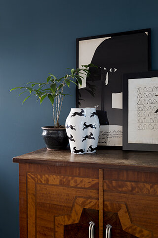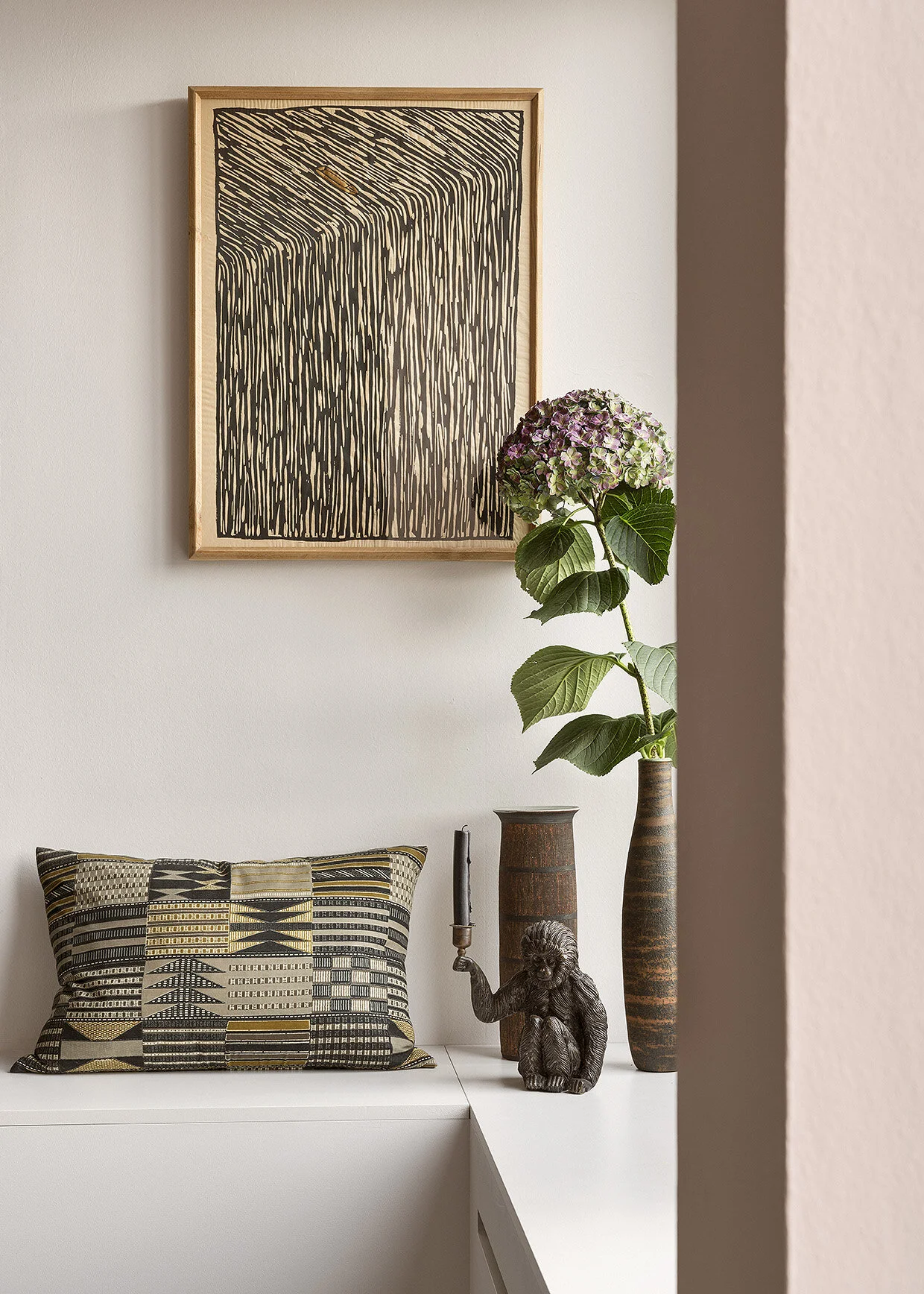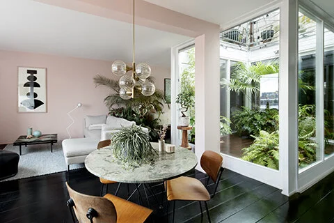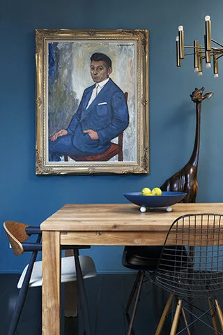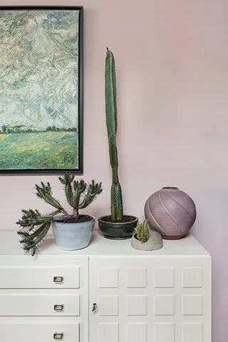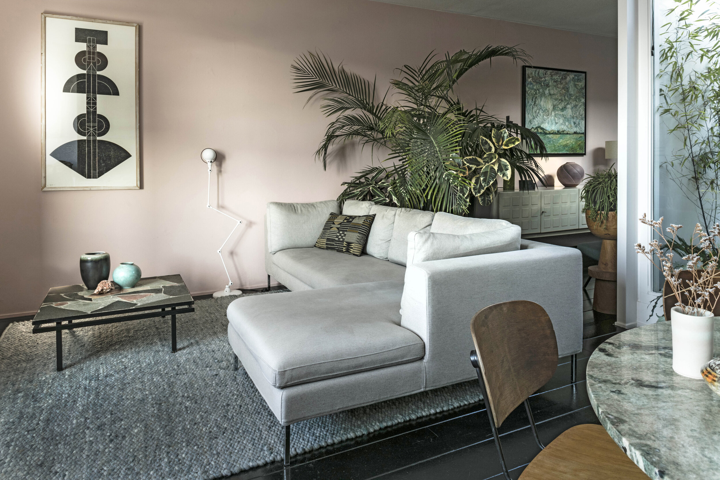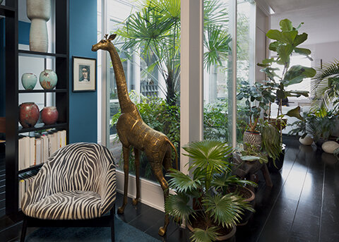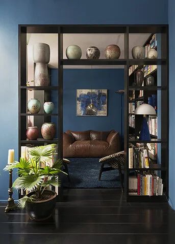 We have created the complete look and feel for this apartment. It was a blank canvas. Considering the amount of light that enters the apartment, we decided on a black floor, that would offset the furniture beautifully. We created a colour scheme and decided on different corners that would break up the large open space. In the back of the apartment, the mood is set for the evening / winter. The blue and black tones combined with the selected furniture and items give a warm, intimate feeling. In the front of the apartment, the pink and white tones give a more crisp, light and summery feeling. We enhanced the existing feature of the patio by adding a lot of plants inside and outside and by (seemingly) extending the wooden floor inside the apartment to outside. The hallway on the first floor is reserved for black and white tones and a lot of black and white (graphic) artwork. The hallway on the second floor is colorful. The bedroom and babyroom on the second floor are calm and warm. The art, items and furniture is a combination of (mostly) vintage and (some) new. In collaboration with Jules David and Bisou Gallery. Photography by different photographers for different magazines and books. Manolo Yllera & Patricia Ketelsen for Architectural Digest (AD) Spain April 2017. Noortje Knulst for Wonderplants 2, Lannoo Press, June 2018. Sigurd Kranendonk for VT Wonen May 2018. Dim Balsem for Volkskrant Magazine September 2015.