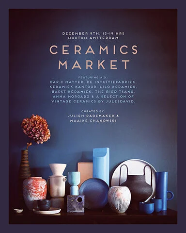 The Hoxton Amsterdam asked us to come up with a ceramics related event that would be hosted in the Hoxton. We came up with a one-day event that would provide information about ceramics and would allow visitors to purchase ceramics from our favorite local ceramists who we asked to join. This event started off with a ceramics discussion panel, accessible for visitors, in which we discussed different making proceses, glazes, ceramic art and the future of ceramics. Afterwards people could enjoy the ceramics market with freshly made and vintage ceramics, drinks and bites. Jennifer Laarman made beautiful flower arrangement throughout the day. Collaboration with Jules David. Photography and set dressing by Maison Chanowski and Jules David.